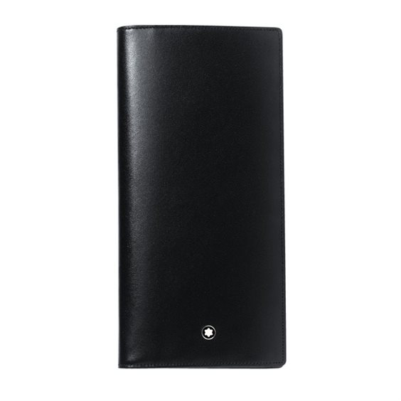 Portafoglio 14 scomparti, in pelle di vitello pieno fiore europea, nero lucido esclusivo Montblanc, fodera jacquard con marchio Montblanc, emblema Montblanc con anello finitura palladio, 14 tasche per carte di credito, ampia tasca con cerniera, 2 scomparti per banconote, 2 tasche extra