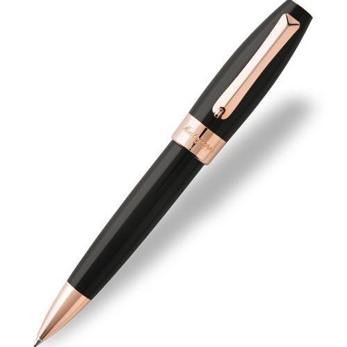 PENNA A SFERA DELLA COLLEZIONE FORTUNA DI MONTEGRAPPA. RESINA NERA E ACCIAIO PVD ORO ROSA.