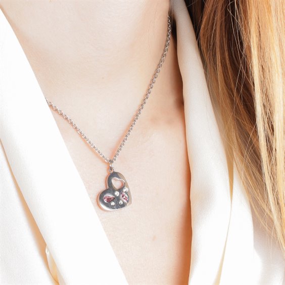 Collana donna in acciaio 316L , girocollo maglia rolò , lunghezza cm 45 regolabile fino a cm 40 , cuore pendente cm 2,5 , zirconi rosa e bianchi incastonati.
