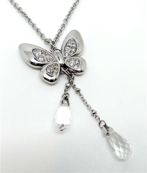 collana in acciaio donna con ciondolo a farfalla con zirconi e pendenti in cristallo bianco.