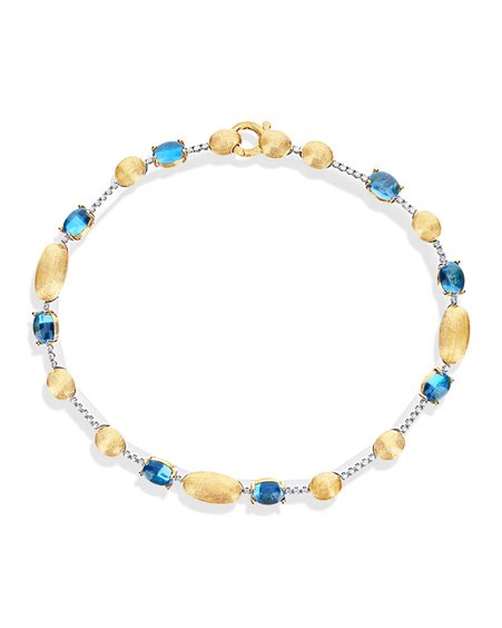 Un’azzurra pioggia di Blu London Topaz, resa ancora più affascinante dalle boules in oro 18kt incise a mano, che si rincorrono lungo scintillii di diamanti. Una piccola opera d’arte dedicata ai colori dell’oceano. Ref. BS5-597 Lunghezza: 17,80 cm DIAMANTI: - Peso (totale): 0.20 CT - Purezza: VS - Colore: G - Taglio: brillante rotondo Pietre colore: - TOPAZIO BLU LONDON Peso (totale): 3.20 CT