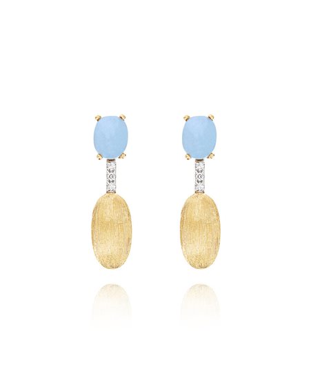 Raffinati orecchini in oro 18kt e acquamarina milky coronati da eleganti dettagli di diamanti. La sofisticata lavorazione in oro gioca con la luce e con la pietra naturale, nota anche per la sua capacità di favorire la crescita interiore e l’introspezione. DIAMANTI: – Peso (totale): 0.02 CT – Purezza: VS – Colore: G – Taglio: brillante rotondo Pietre colore: – ACQUAMARINA MILK Peso (totale): 0.73 CT