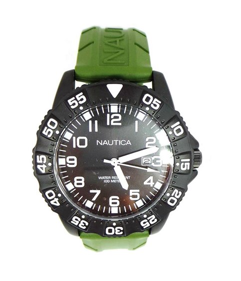 Orologio solo tempo con cassa in acciaio nero satinato mm 44, con fondo nero e numeri bianchi. Lancette e indici fosforescenti di notte. Cinturino in silicone verde militare con logo inciso sopra. Corona a vite e fondello in acciaio a vite, WR 100 mt.