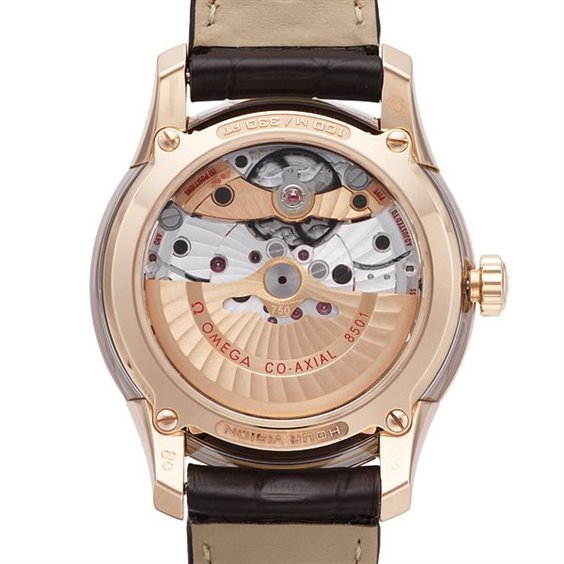 Lanciato per la prima volta nel 2007, il De Ville Hour Vision di OMEGA mostra la complessità dell'abilità artigianale nei dettagli ricercati del raffinato quadrante e nel meccanismo che anima questo segnatempo. Questo modello presenta un quadrante marrone, con anello rodiato scanalato e datario a finestrella con indicazione di mese e data a ore 3. Un vetro zaffiro resistente ai graffi protegge questo quadrante eccezionale. La lunetta in oro rosso 18K è montata su una cassa da 41 mm in oro rosso 18K e parte interna in vetro zaffiro, corredata da un cinturino in pelle marrone. Questo straordinario orologio è animato dal calibro OMEGA 8611 Co-Axial, visibile attraverso il fondello trasparente. Calibro: Omega 8611 Movimento a carica automatica dotato di scappamento Co-Axial. Calendario annuale a scatto immediato. Spirale in silicio sul bilanciere a spirale libera (senza racchetta), 2 bariletti montati in serie, carica automatica bidirezionale. Massa oscillante e ponte del bilanciere in oro rosso 18K. Pregiata finitura con esclusivo motivo 'Côtes de Genève' arabescato. Riserva di carica: 55 ore Tipo: Carica automatica