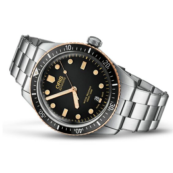 OROLOGIO ORIS DIVER'S SIXTY FIVE NERO COLLEZIONE: - MOVIMENTO: automatico Swiss Made - CAL. Oris 733 base SW 200- - RISERVA DI CARICA: 38 ore - CASSA: bicolore in acciaio/bronzo - QUADRANTE: nero con indici in Superluminova - BRACCIALE: i acciaio fibbia deployante - VETRO: minerale zaffiro - FUNZIONI: ore, minuti, secondi, datario - IMPERMEABILITA: 10 Atm - GARANZIA UFFICIALE 24 mesi