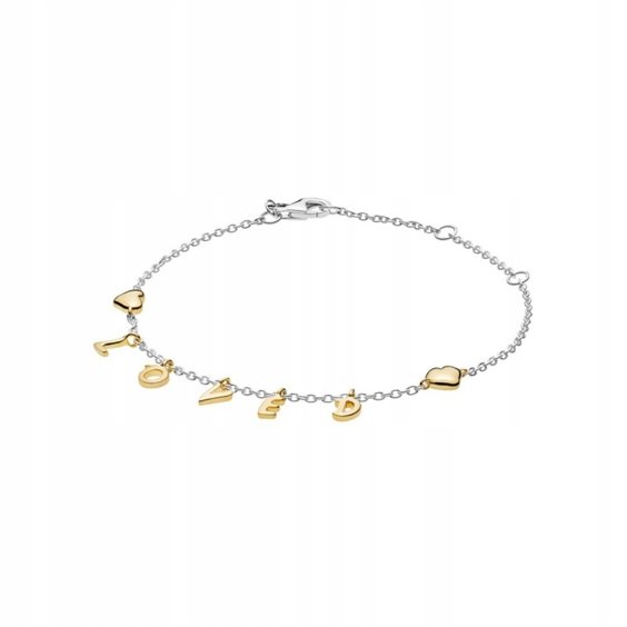 Le lettere pendenti creano la scritta ‘Loved’ racchiusa tra due cuori. L’abbinamento di argento e PANDORA Shine fa sì che questo bracciale sia unico e di tendenza.