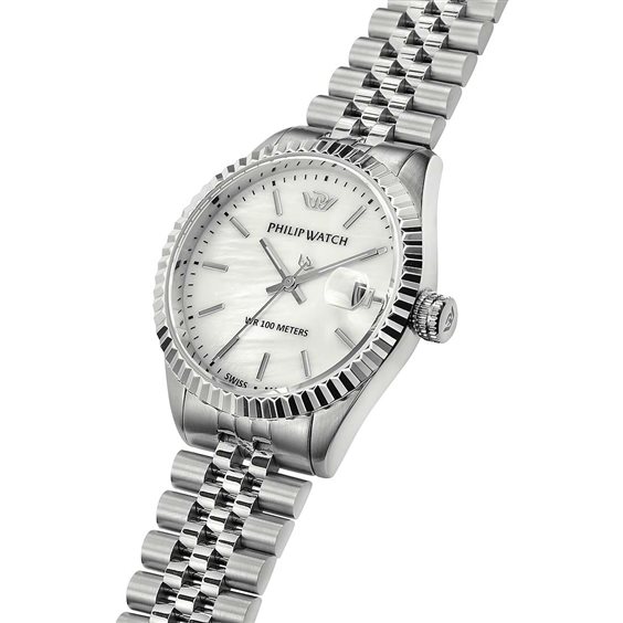 Orologio Philip Watch Caribe - R8253597594 - Philip Watch experience: Urban, Genere : Donna, Materiale e finitura cassa: Acciaio, Misura cassa: 3,5 cm, Spessore cassa: 9,15, Finitura cassa: Satinato, Vetro: Vetro zaffiro, Materiale cinturino: Bracciale in metallo, Colore cinturino: Argento, Chiusura: Double push buckle, Movimento: Quarzo, Swiss made: Sì, Water resistant: 10 atm, Garanzia: Ufficiale 2 anni Philip Watch, Confezione: Originale Philip Watch