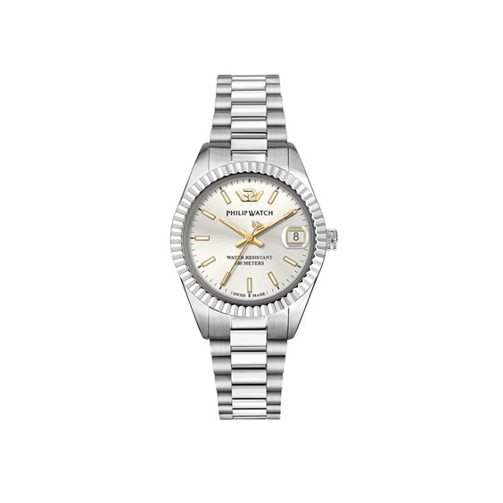 OROLOGIO DONNA IN ACCIAIO COLLEZIONE CARIBE.CASSA 28MM,10ATM.MOVIMENTO AL QUARZO,VETRO ZAFFIRO E FONDELLO A VITE.QUADRANTE SUNRAY CHAMPAGNE CON FINITURE IN OERO GIALLO.