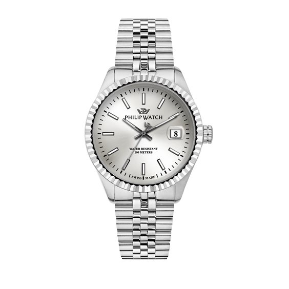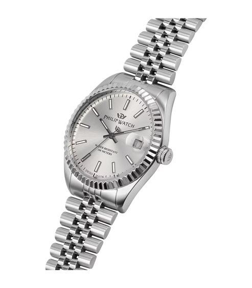 Orologio Philip Watch uomo. Multifunzione Cassa in acciaio di 39 mm color silver Quadrante silver, lunetta zigrinata Vetro Zaffiro Cinturino in acciaio color silver