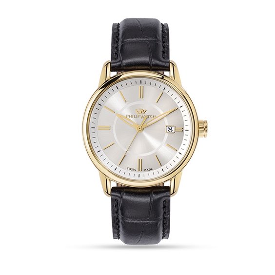Orologio uomo , cassa in acciaio 316L placata in oro giallo , movimento al quarzo RONDA 515 , cassa mm 40 , quadrante silver con indici oro , datario , fondello a vite , vetro minerale , cinturino in pelle nero stampato.Immagine indicativa , la confezione può variare in forma e colore.