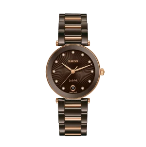 LaCoupole rievoca il fascino intramontabile delle icone del passato, reinterpretato per l’uomo contemporaneo che ama distinguersi. L’eccellenza del design si unisce all’innovazione svizzera in una creazione Rado senza tempo. La cassa monoblocco da 31 mm in ceramica high-tech al plasma lucida è sormontata da un cristallo zaffiro bombato, impreziosito da un bordo metallizzato color oro grigio e rosa. Impermeabile fino a 5 bar (50 metri), garantisce affidabilità e stile in ogni situazione quotidiana. Il design riflette la firma Rado: elegante, armonioso e intramontabile. Sul quadrante grigio, raffinati motivi ondulati laccati danno vita a un sofisticato effetto tridimensionale. 11 diamanti Top Wesselton taglio brillante segnano le ore con raffinata luminosità, mentre il datario a ore 6 aggiunge un tocco funzionale di classe. Il cuore pulsante è il calibro al quarzo R218 a 8 rubini, ottimizzato con PreciDrive™ per una precisione senza pari. Completa il design un bracciale in ceramica high-tech plasma lucida, arricchito da elementi e fibbia con finitura PVD oro rosa, per un equilibrio perfetto. LaCoupole incarna l’eleganza senza tempo: pensato per affascinare e realizzato per resistere al passare degli anni.