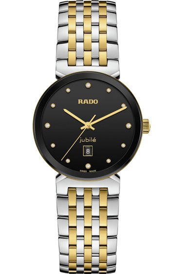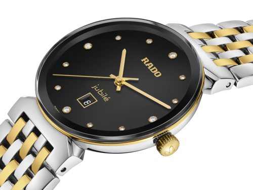 L’armonioso design del Rado Florence Classic rievoca le eleganti cupole e le torri della città da cui la collezione prende il nome. L'orologio, del diametro di 30 mm, dispone di un cristallo zaffiro ricurvo arrotondato edge-to-edge. Il bracciale, realizzato in acciaio lucido con maglie centrali color oro giallo, definisce l’estetica di questo classico segnatempo. Il quadrante nero soleil, arricchito da 12 brillanti e impreziosito dal logo “jubilé” stampato, si abbina alla perfezione alle lancette color oro giallo. Grazie al movimento al quarzo calibro R079 a tre lancette, il segnatempo è dotato della massima precisione e resistenza agli urti. L'orologio è impermeabile fino a 50 m ed è disponibile anche nella taglia L, il che lo rende l’esemplare ideale per le coppie.