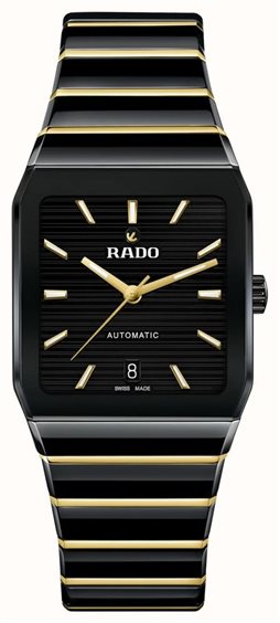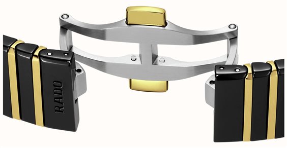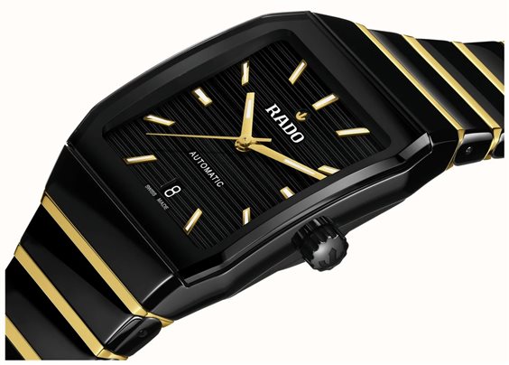 Fin dal suo debutto nel 1983, Rado Anatom è stato simbolo di un design all’avanguardia e di un comfort estremo. Il suo tratto distintivo è il vetro zaffiro cilindrico metallizzato con bordi smussati su entrambi i lati, che si estende in maniera fluida nel bracciale in ceramica high-tech, creando una forma liscia e continua che fonde la cassa e il bracciale in un’unica linea uniforme e coesa. Realizzato con maglie in ceramica high-tech nera lucida e maglie centrali in acciaio inossidabile rivestite in PVD color oro giallo lucido, il bracciale è perfettamente chiuso da una fibbia a tre pieghe in acciaio inossidabile spazzolato. Sotto questo caratteristico cristallo si trova un quadrante laccato nero che rivela un sorprendente motivo di linee orizzontali irregolari. Le lancette e gli indici applicati color oro giallo sono dotati di un rivestimento Super-LumiNova® bianco che crea un raffinato contrasto con la profondità del quadrante. A coronare il quadrante a ore 12 c’è l’iconica ancora mobile, accompagnata da una finestrella discreta per la data, posizionata a ore 6. Nel suo cuore pulsante, esaltato dal fondello in vetro zaffiro, batte un calibro automatico R766 a 21 rubini. Regolato finemente in cinque posizioni e dotato di una molla Nivachron™, questo movimento offre un alto livello di precisione e una notevole riserva di carica di 72 ore, sottolineando l’impegno di Rado per la perfezione.