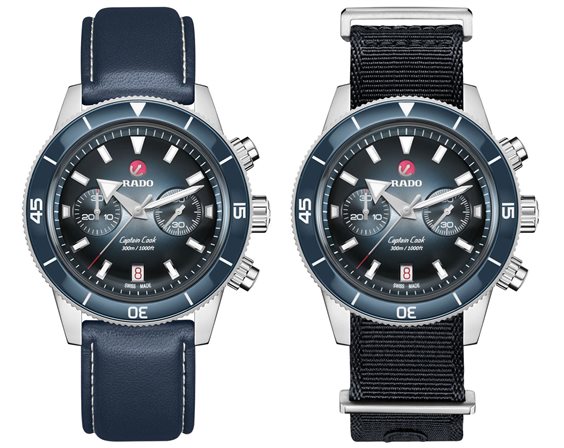Il Captain Cook Chronograph vanta il caratteristico cristallo zaffiro sagomato antigraffio con trattamento antiriflesso su entrambi i lati. La cassa sottile ed elegante da 43 mm in acciaio dispone di un inserto in ceramica hi-tech blu lucido sulla lunetta, in abbinamento al quadrante sfumato dall’argento al blu. Numeri, indici e triangoli sono rivestiti in Super-LumiNova®. All'interno, il nuovo e più sottile movimento automatico R801, con 37 rubini, cinque lancette e 59 ore di riserva di carica grazie alla spirale antimagnetica Nivachron™ supera i requisiti standard nei test di precisione da 3 a 5 posizioni. L’esemplare è dotato di un bracciale in acciaio lucido e spazzolato, oltre a un cinturino in pelle blu e a un cinturino aggiuntivo in tessuto blu scuro.