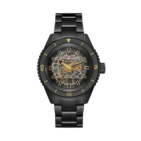 Il Captain Cook High-Tech Ceramic Limited Edition non è soltanto il primo orologio Rado azionato dal nuovo calibro R808, ma anche il primo Captain Cook dotato di inserti in ceramica hi-tech e trattamento anti-impronta. Inoltre, per la prima volta, l’intera lunetta e la corona sono realizzate in ceramica hi-tech. Il movimento a tre lancette supera gli standard di precisione nei test da 3 a 5 posizioni grazie alla sua spirale antimagnetica Nivachron™. Questo iconico orologio del diametro di 43 mm è impermeabile fino a 300 m e vanta una riserva di carica di 80 ore. Caratterizzato dalla cassa in ceramica hi-tech nera opaca e dal cristallo zaffiro fumé, il suo design sfida i compromessi, in linea con la ben nota tradizione Captain Cook. Un bracciale nero opaco in ceramica hi-tech dotato di fibbia in titanio a tripla piega con pulsanti in ceramica completa alla perfezione il design. Il segnatempo è realizzato in soli 1962 esemplari numerati.