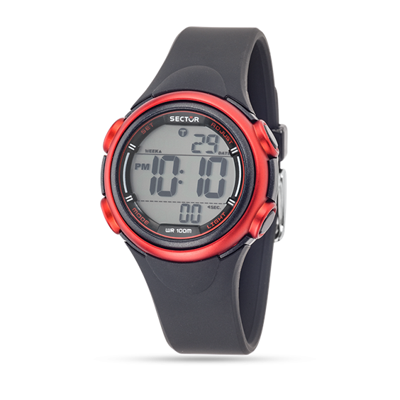 OROLOGIO SECTOR DA DONNA DIGITALE. LA FORMA DELLA CASSA DELL'OROLOGIO È TONDA, MISURA 36 MM E MONTA UNA LENTE IN PLASTICA. IL CINTURINO È IN PU COLORE NERO CON CHIUSURA ARDIGLIONE. RESISTENTE ALL'ACQUA FINO A 10 ATM.