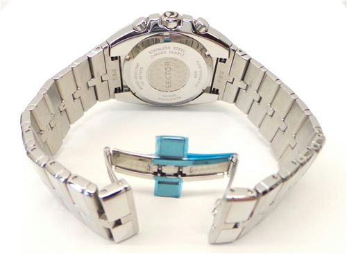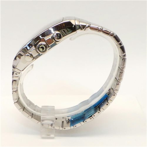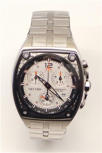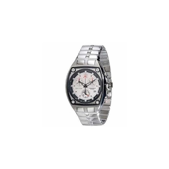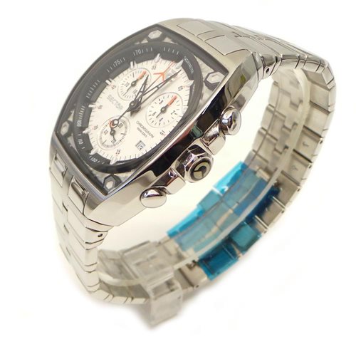 Orologio Cronografo. Cassa acciaio lucido tonneau, fondello e corona a vite, dimensioni 40x47 mm.,spessore 13,5 mm. bracciale 22 mm. Movimento cronografo al quarzo Swiss Made. Vetro minerale tonneau. Quadrante bianco opaco, lancette luminor. Bracciale regolabile in acciaio con chiusura a scomparsa. Impermeabile 100 metri. Peso complessivo 193 grammi.