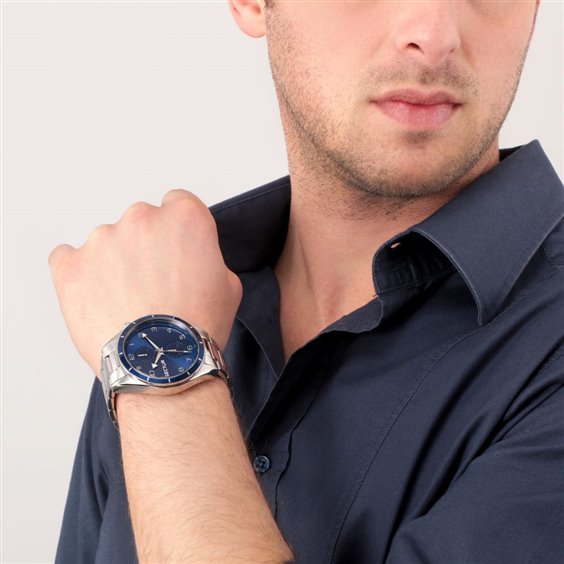 Sector 770 , orologio uomo , acciaio 316L , movimento multifunzione al quarzo tmi-vd36 , quadrante blu , numeri acciaio , ghiera blu elettrico , vetro minerale , fondello a pressione , cinturino regolabile , maglie lucide e satinate , chiusura con sicurezza. Immagine indicativa , la confezione può variare di forma e colore , scatola e garanzia originali.