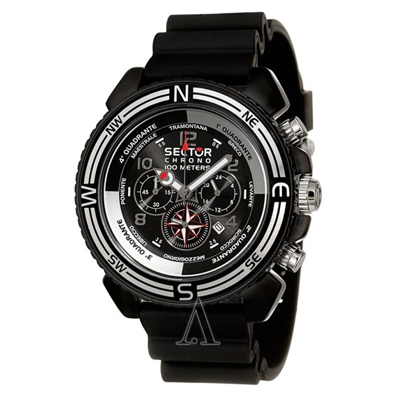 Modello Centurion Special Edition, orologio dal profilo fortemente sportivo, cassa in acciaio colorato nero PVD, cronografo, quadrante con Rosa dei Venti, water resistant 10 ATM con corona a vite.