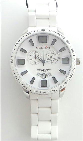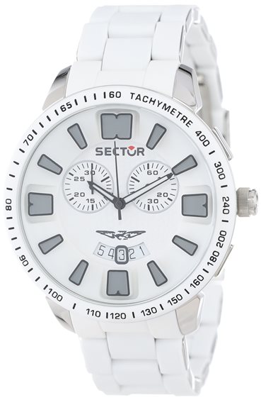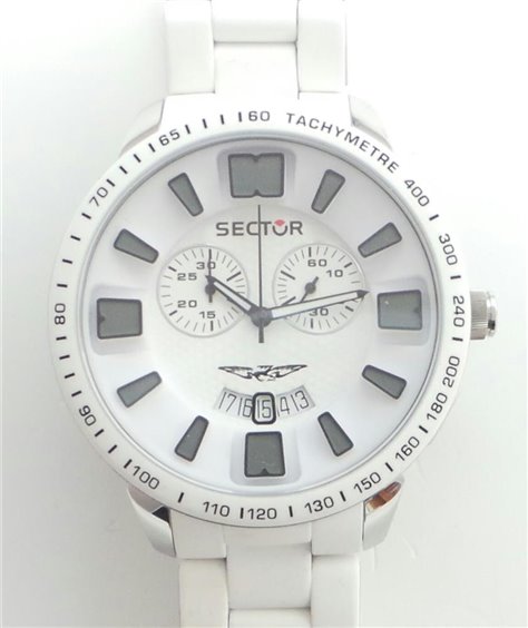 Orologio Sector da uomo, tutto bianco, cassa e bracciale in acciaio ricoperto da gomma soft touch, al tocco vellutata. Particolarissimo quadrante in 3D, cronografo con datario centrale. Resistente all'acqua 100 m. chiusura in acciaio con sicura.