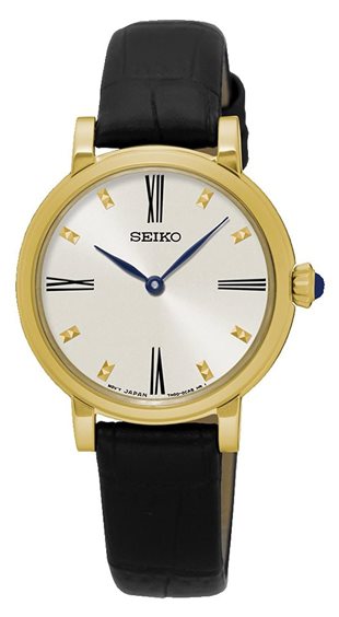 Orologio da donna cassa rotonda dorata, quadrante bianco con lancette blu e indici dorato e numeri romani. Fondello a pressione in acciaio. Vetro hardlex e cinturino in pelle nera.