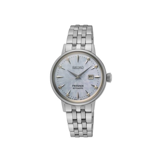 Il nuovo Presage Cocktail SRE007J1 si ispira al cocktail Sky Diving e con la texture leggera del suo quadrante richiama l'azzurro del cielo. Il quadrante è sottile e delicato con una finitura ordinata. Diversi strati di un rivestimento trasparente vengono applicati al quadrante prima di essere levigati per un effetto abbagliante. Otto diamanti posti a livello degli indici aggiungono un tocco di lusso e glamour al polso.