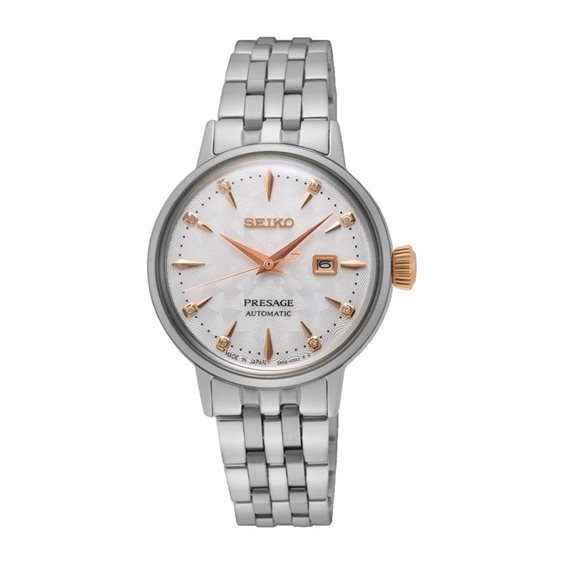 Il modello Seiko Presage Cocktail SRE009J1 si ispira al cocktail Clover Club. Questo orologio presenta un quadrante bianco con lancette e indici in oro rosa. Il quadrante è sottile e delicato con una finitura ordinata. Diversi strati di un rivestimento trasparente vengono applicati al quadrante prima di essere levigati per un effetto abbagliante. Otto diamanti posti a livello degli indici aggiungono un tocco di lusso e glamour al polso.