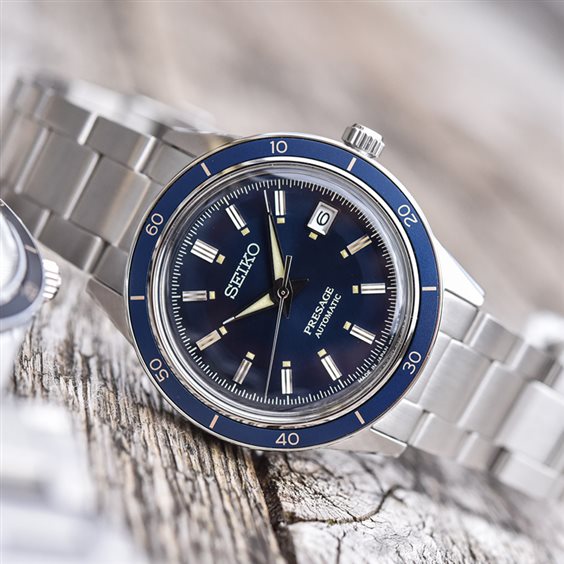 Presage movimento 4R35 meccanico a ricarica automatica o manuale con fermo macchina, riedizione di un modello Seiko anni 60. riserva di carica oltre 41 ore. Quadrante blu, con meravigliosi riflessi, datario a ore tre, sfere con lumibrite per visione notturna, ghiera esterna fissa IP blu, vetro hardlex bombato brevetto seiko. fondello avvitato con vetro per visione completa del movimento, garantisce una resistenza all'acqua di 5bar, bracciale in acciaio, con doppio pulsante di apertura. Corona con logo Seiko con funzione anche di carica manuale e fermo-macchina. diametro 40.5 lunghezza ansa/ansa 47mm.