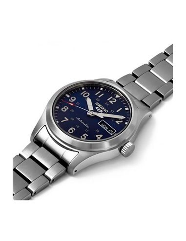 Orologio automatico da uomo Seiko 5 Sports ref. SRPG29K1. Cassa da 39,4 mm in acciaio inossidabile, fondello a vite con movimento a vista, quadrante blu con sfere ed indici luminescenti, datario e giorno della settimana a ore 3. Bracciale in acciaio con tripla chiusura deployante e sicurezza. Peso 146 grammi. Movimento meccanico automatico calibro 4R36 con riserva di carica di 41 ore. Vetro Hardlex ricurvo (vetro minerale temperato). Water resistant fino a 100 metri.