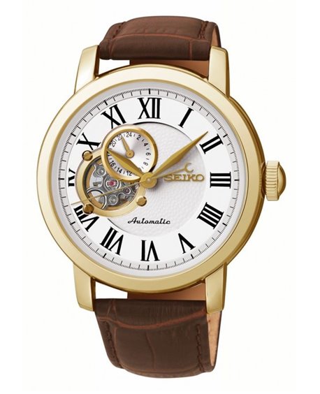 Orologio Automatico Seiko Solo Tempo con cassa 40,5mm in Acciaio con trattamento color oro, fondello e quadrante con movimento a vista. Cinturino in pelle marrone stampa cocco.