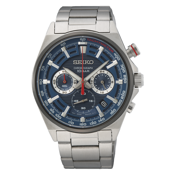 Questo orologio al quarzo della collezione Seiko SPORT è ricco di funzioni. Il suo quadrante blu profondo presenta i tre contatori del cronografo ed è circondato da una lunetta tachimetrica. Questo modello interamente in acciaio inossidabile è anche molto solido con il suo vetro hardlex, il suo fondello a vite e la sua resistenza all'acqua fino a 100 metri.