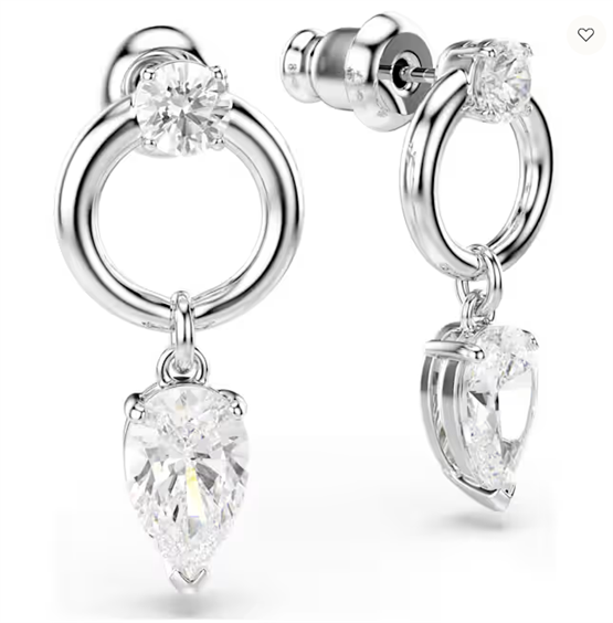 Cattura la luce da ogni angolazione con questi orecchini Mesmera unici. Ogni scintillante motivo presenta una Swarovski Zirconia taglio Pear, applicata a un lussuoso cerchio placcato rodio. Al centro è collocata anche una Swarovski Zirconia taglio Round. Indossali insieme al pendente coordinato per creare il tuo splendido set.