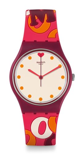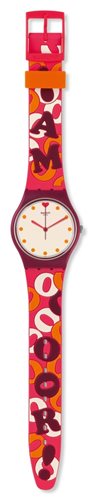 Questo orologio ti farà battere forte il cuore e ti permetterà di indossare il tuo 'amor' al polso! Il quadrante beige è decorato da indici arancioni e da un cuore rosso a ore 12. La cassa in plastica satinata bordeaux è abbinata a un cinturino in silicone opaco rosa con le lettere a-m-o-r stampate in ordine sparso. Il design a tema “latin lover” è completato da un passante in silicone arancione e da una fibbia in plastica satinata rosa.