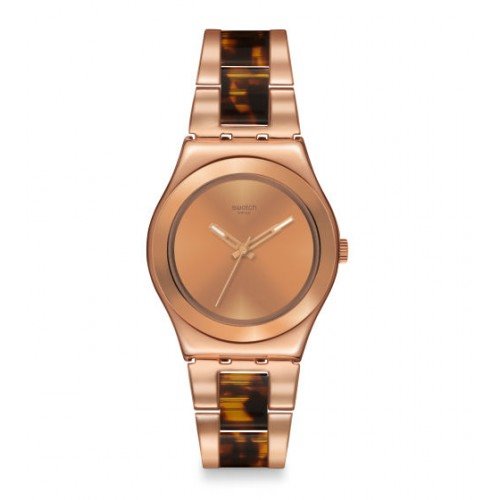 Marchio SWATCH dal 1983 leader mondiale della categoria. Orologio della linea Irony Medium, con cassa da 33.00mm di diametro in acciaio con trattamento PVD oro rosa e bracciale dello stesso materiale con elemento centrale in resina. Materiali ipoallergenici. Resistente all' acqua, agli urti, precisione al quarzo. SWISS MADE. Scatola originale e due anni di garanzia ufficiale SWATCH.
