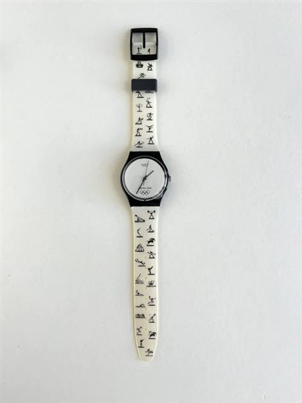 Edizione speciale - Swatch Olympia Gent Athlimata Orologio dedicato alle olimpiadi di Atene 2004. Il cinturino in plastica bianca presenta una stampa raffigurante atleti di diverse discipline sportive. La cassa nera racchiude un quadrante bianco con i cerchi olimpici.