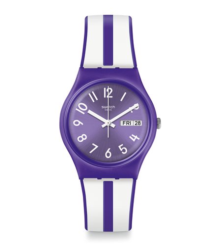 In NUORA GELSO (GV701) il viola brillante sul quadrante spazzolato prosegue nella riga al centro del cinturino bianco. Cassa, fibbia e passante viola esaltano l'energia del design.
