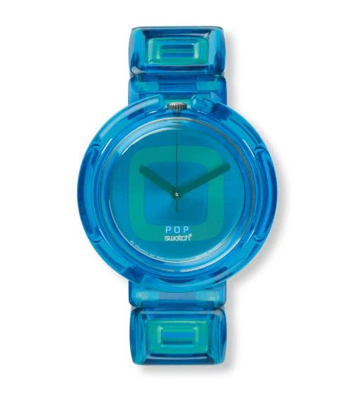 Il Midi Pop Swatch MENTHE A L'EAU è estremamente elegante e raro. Ha un cinturino elastico fatto di cubi di plastica blu/verde. Il quadrante, anch'esso blu, presenta questa forma e lancette blu. L'esclusivo orologio è resistente all'acqua e ha un movimento al quarzo ETA di precisione. Il diametro del Midi Pop Swatch è di 32 mm. Questo è più piccolo del Pop Swatch standard che ha un diametro di 39 mm. Circonferenza del braccio - piccola 14 - 17 cm
