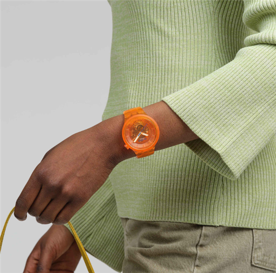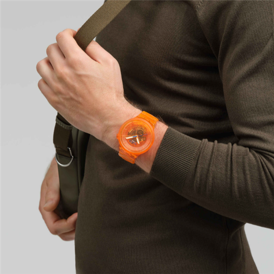 Questo orologio oversize arancione vanta un look completamente trasparente, dalla cassa, al quadrante, alla lunetta e al bracciale biosourced con fibbia a farfalla. Il quadrante arancione trasparente biosourced offre una visione del movimento, mentre le lancette delle ore e dei minuti arancioni fosforescenti e la lancetta dei secondi blu a contrasto indicano l'ora sotto il vetro biosourced.
