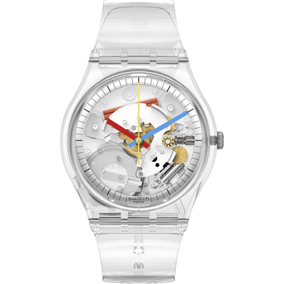 Un anello argentato brilla sul quadrante di questo orologio trasparente con lancette rosse, blu e gialle e indici neri. Completano il look una cassa biosourced trasparente e lucida e un cinturino in TPU trasparente.