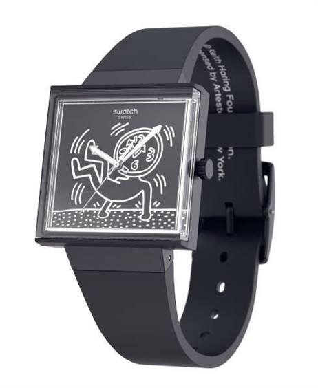 BREAK LOOSE La cassa quadrata nero opaco del BIOCERAMIC è dotata di un vetro biosourced edge-to-edge che offre una vista laterale del modello bianco stampato sul quadrante. Il quadrante nero quadrato presenta lancette color argento fosforescenti a forma di freccia per le ore e i minuti e una lancetta dei secondi color argento. Il quadrante e la cassa sono completati da un cinturino biosourced integrato nero opaco, con passante biosourced e fibbia BIOCERAMIC abbinati. Il copribatteria nero opaco con stampa bianca sul retro raffigura il logo Swatch creato da Keith Haring.