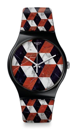 Ispirato ai palazzi e ai marmi del Rinascimento italiano, PAVIMENTO (SUOB142) porta la dolce vita al tuo polso. Il quadrante è decorato da un motivo ottico multicolore, ed è alloggiato in una cassa in plastica lucida nera. Il modello è completato da un cinturino in silicone opaco nero con stampa in tema, passante in silicone nero opaco e fibbia in plastica lucida nera.