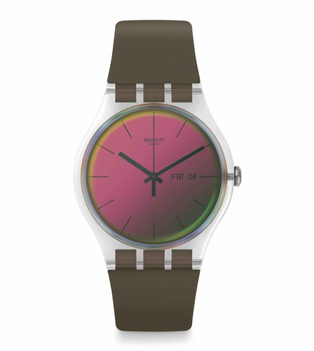 Accendi il tuo look di tutti i giorni con POLARMY (SUOK714). Il quadrante rosa e il vetro Swatch Solar Spectrum spezzano la monotonia, mentre il cinturino verde militare segue i trend della stagione.