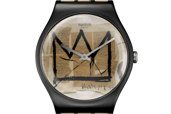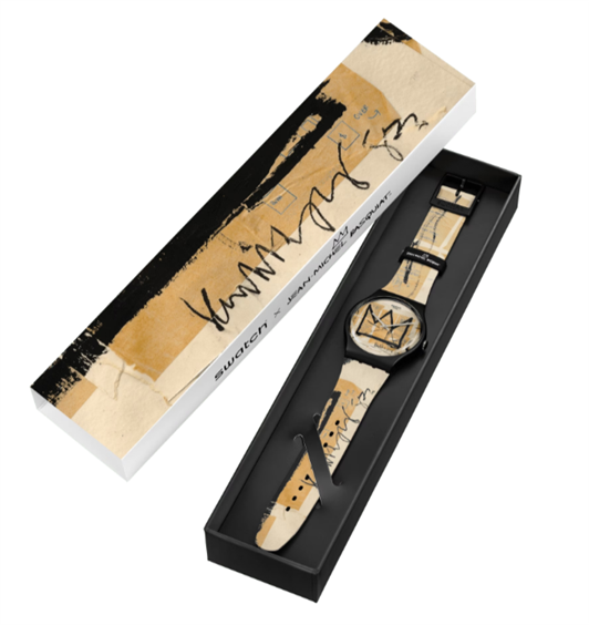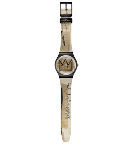 UNTITLED BY JEAN-MICHEL BASQUIAT riproduce l’opera di Jean-Michel Basquiat Untitled, in cui la corona è l’elemento centrale del quadrante su cassa nera. In contrasto con la parte interna tutta nera, il cinturino stampato ricrea le giustapposizioni originali e gli schizzi a olio tipici dell’opera di Basquiat. Il passante è stampato con il nome dell’artista. © Estate of Jean-Michel Basquiat. Licensed by Artestar, New York.