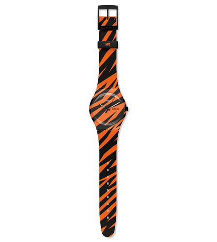 Grinta allo stato puro con questo Swatch in edizione limitata creato in collaborazione con il motociclista Mathieu 'Mat' Rebeaud, Proteamer Swatch. La base arancio dell'orologio è graffiata da una stampa nera che ne ricopre l'intera superficie, per un effetto zebrato unico e molto amato dall'atleta.