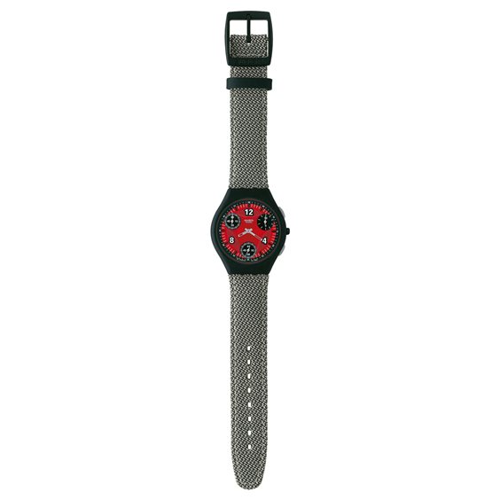 orologio con movimento al quarzo brand Swatch, ore minuti e cronografo. Quadrante rosso con contatori neri, cassa in resina nera ultrapiatta. cinturino in tessuto grigio. Serie Skin. Water resistant 30mt. Nuovo con garanzia.