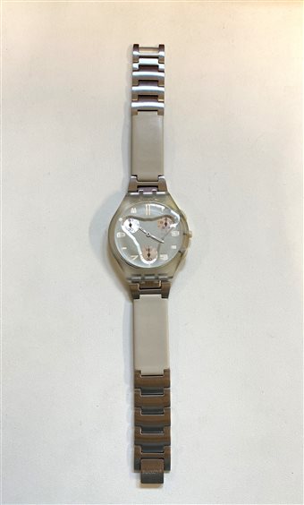 Orologio Swatch skin chrono, cassa in plastica trasparente opaco, cinturuno in pelle color avorio e chiusura in acciaio satinato