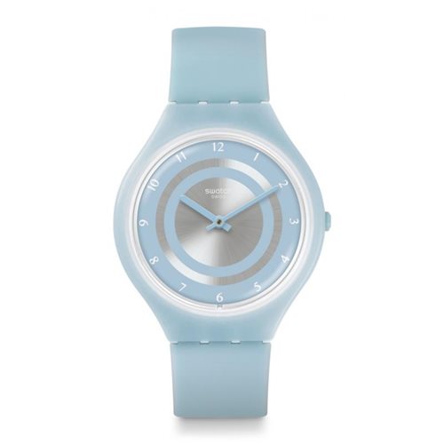 SWATCH SKIN SVOS100 dalla cassa ultra-sottile, con quadrante spazzolato argentato con indici azzurri e bianchi. La cassa in plastica da 36.8 mm è composta da una parte frontale azzurra e una parte posteriore bianca. A completare questo modello delicato troviamo un cinturino con passante in silicone opaco azzurro e fibbia in plastica lucida azzurra.