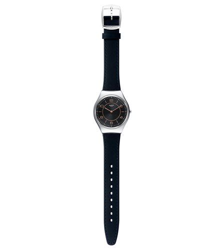 Con l’unione di nero e blu, SKINCOUNTER (SYXS110) presenta un quadrante scuro illuminato da dettagli Swatch dorati e un cinturino in pelle blu con eleganti cuciture sui bordi.