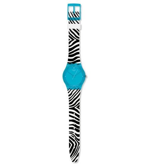 OROLOGIO DA UNISEX, FAMIGLIA ANIMALS, CON CASSA IN PLASTICA AZZURRA E CINTURINO IN SILICONE BIANCO E NERO, CHIUSURA CON FIBBIA AD ARDIGLIONE CON LOGO, DIAMETRO CASSA 34MM, SPESSORE CASSA 8,75MM, QUADRANTE AZZURRO, WR 3 BAR, QUARZO, GARANZIA UFFICIALE SWATCH 2 ANNI, SWISS MADE.