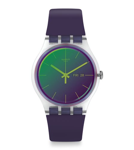 Dal viola al verde: l’affascinante quadrante di POLAPURPLE (SUOK712) ti sorprende con nuove sfumature. Il cinturino satinato è viola scuro mentre la fibbia e la cassa sono trasparenti.